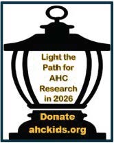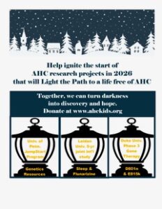 This holiday season, we invite you to join us in a powerful movement to Light the Path for AHC Research in 2026. Your year-end gift will illuminate the road ahead for groundbreaking studies, innovative collaborations, and the accelerating search for answers that every AHC family deserves. Three of the projects needing funding in 2026 are: